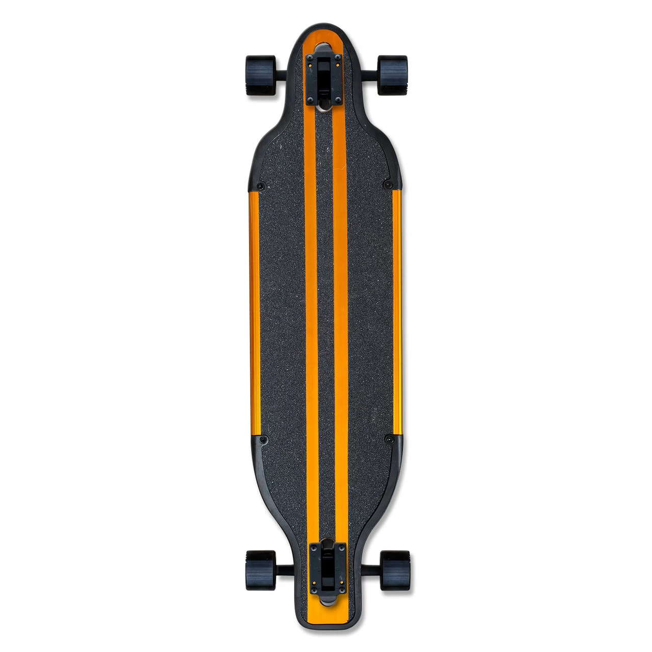 Aluminum Drop Through Longboard This longboard’s deck has cutouts that allows the trucks baseplates to be mounted to the top of the deck. This provides a lower ride that gives more stability at greater speeds.