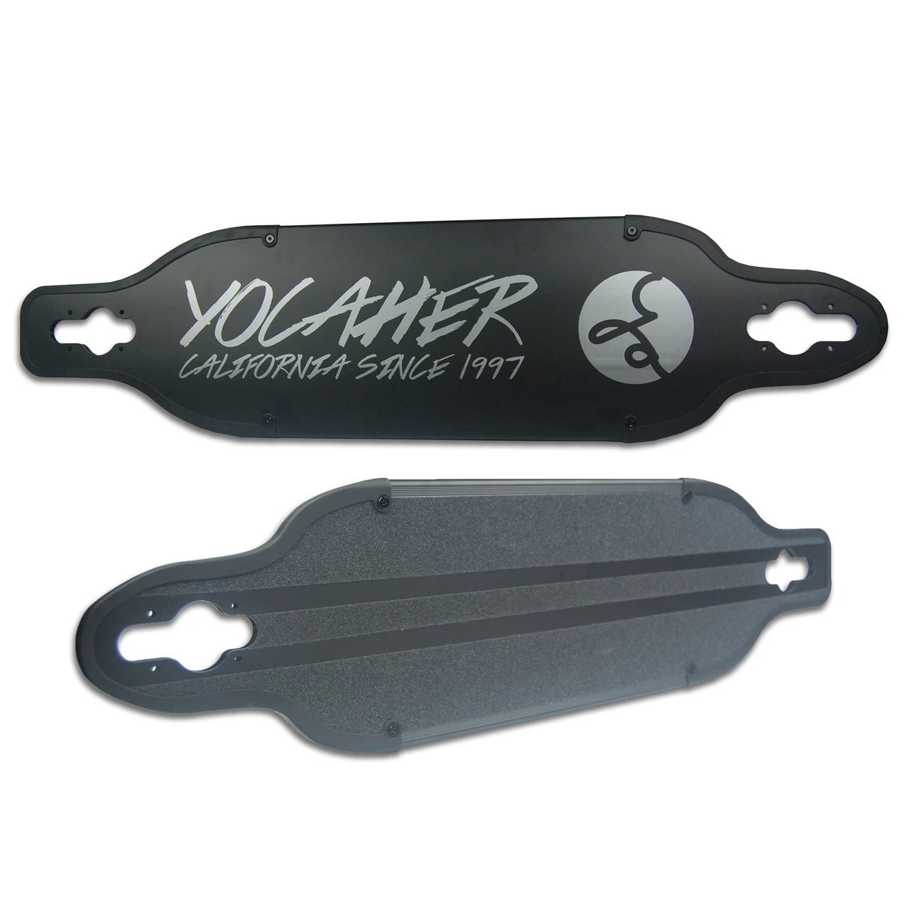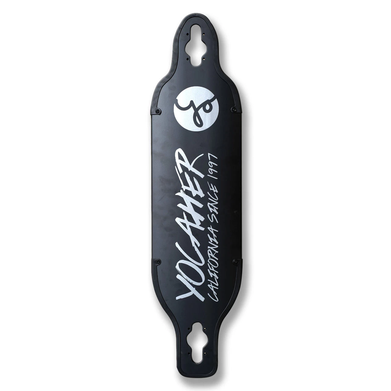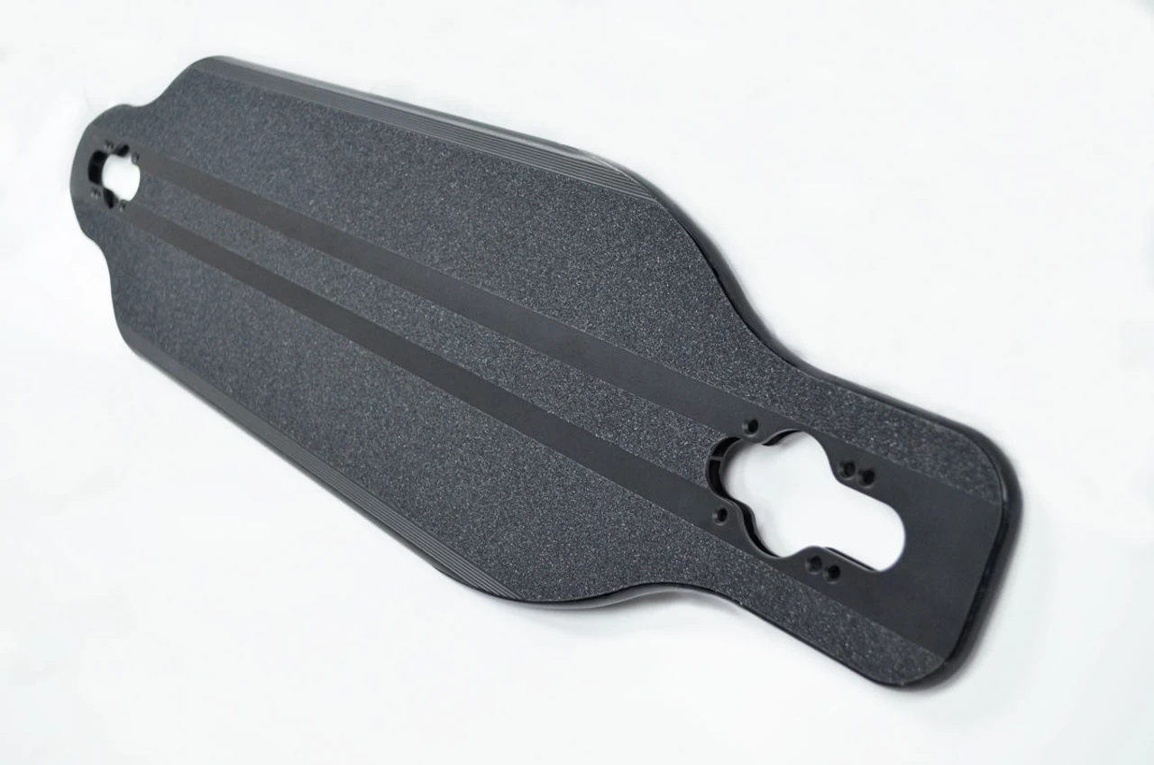 Aluminum Drop Through Longboard This longboard’s deck has cutouts that allows the trucks baseplates to be mounted to the top of the deck. This provides a lower ride that gives more stability at greater speeds.