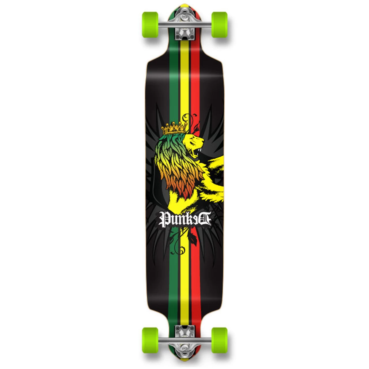 Complete Rasta Drop Down Longboard The Drop Down deck is designed to provide with the rider with a lower center of gravity since the foot platform sits lower than the trucks. With no flex, the Drop Down is capable of achieving high speed and is perfect for Downhill riding Rasta This graphic depicts a lion colored with a rasta gradient in the foreground and rasta racing stripes in the background.