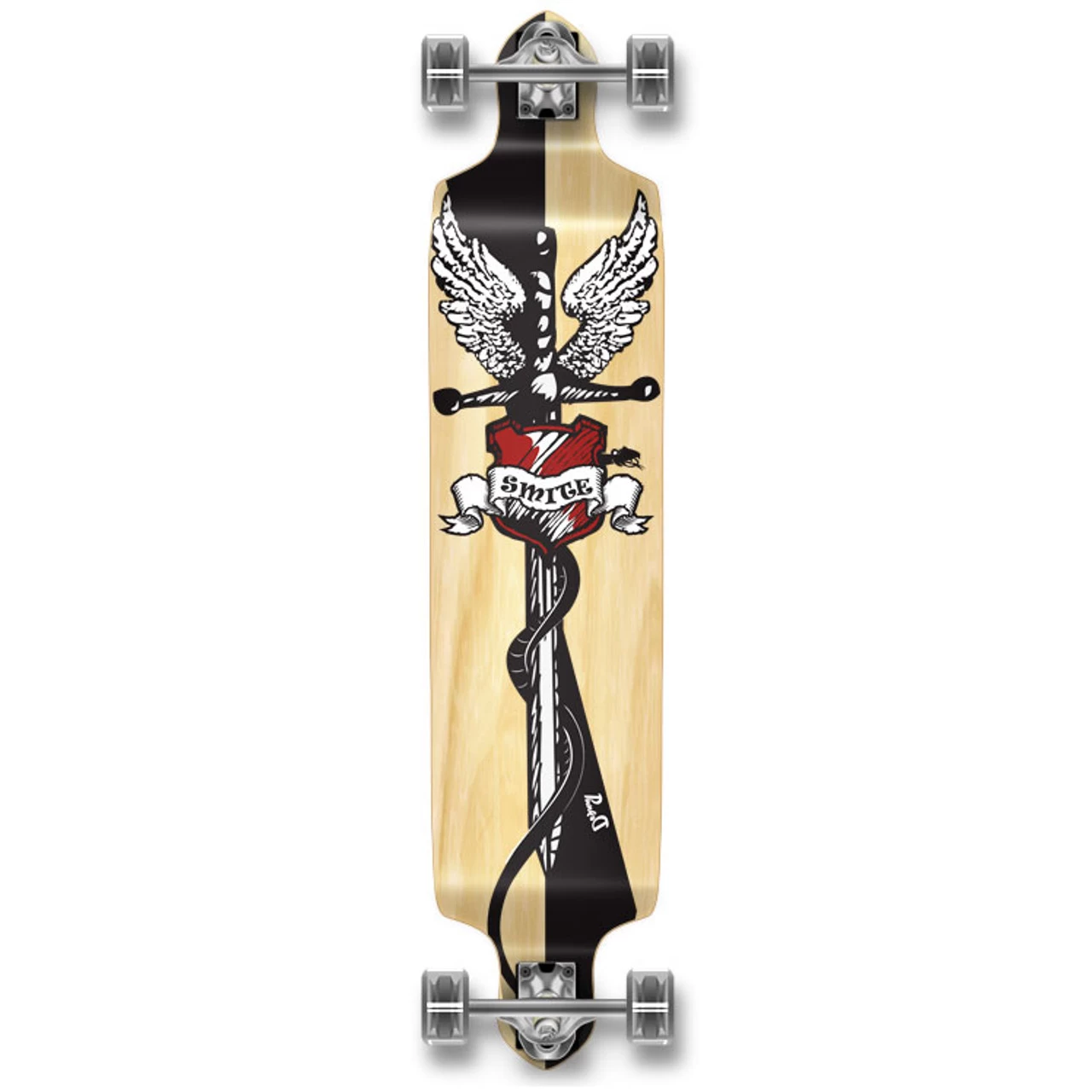 Complete Smite Drop Down Longboard The Drop Down deck is designed to provide with the rider with a lower center of gravity since the foot platform sits lower than the trucks. With no flex, the Drop Down is capable of achieving high speed and is perfect for Downhill riding Smite This graphic depicts an angelic sword and shield used to smite the evil skateboarding foes.