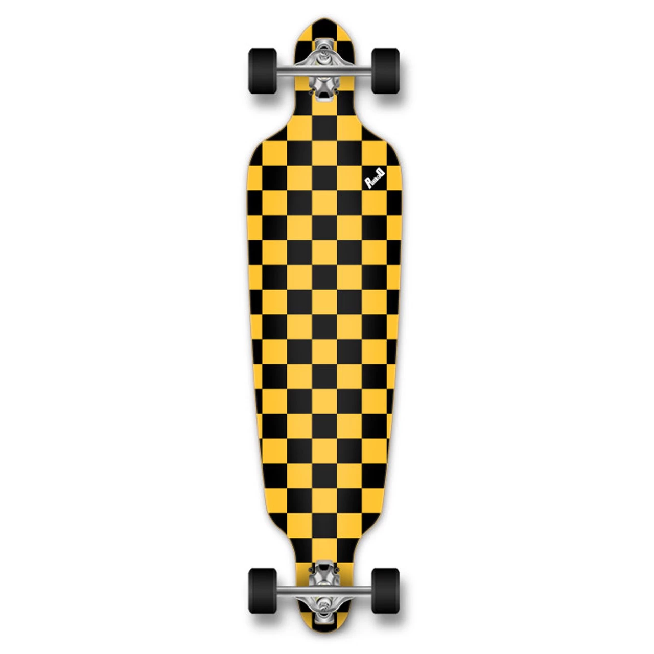 Complete CHECKER Drop Through Longboard The cutouts on the nose and tail allow the trucks to be top-mounted. Top-mounted trucks allow this shape deck to have more stability when riding at speeds that may not be suitable for beginners. The medium concave and low flex allows the rider to maintain control when carving or sliding at higher speeds. Checker This great checker pattern can be found in multiple color variations including blue, red, green, purple, white, pink, yellow, orange, and silver checkers