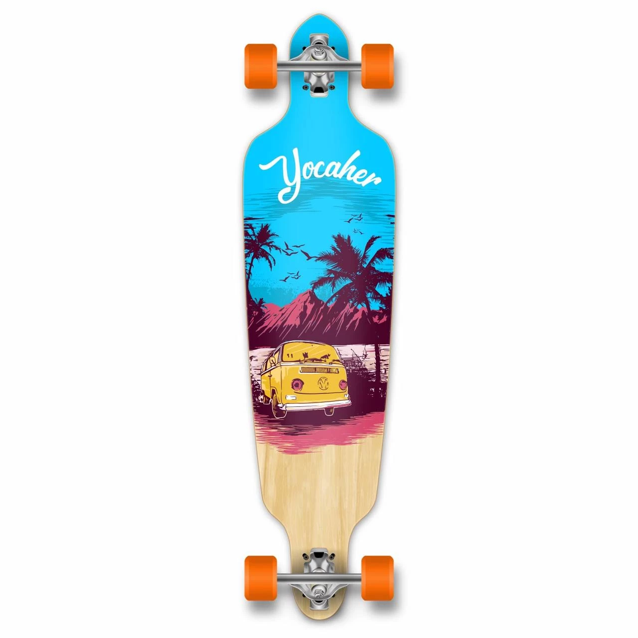 Complete VW Series: Blue N’ Red Drop Through Longboard The cutouts on the nose and tail allow the trucks to be top-mounted. Top-mounted trucks allow this shape deck to have more stability when riding at speeds that may not be suitable for beginners. The medium concave and low flex allows the rider to maintain control when carving or sliding at higher speeds.