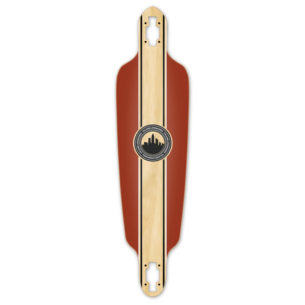 Crest Burgundy Drop Through Deck The cutouts on the nose and tail allow the trucks to be top-mounted. Top-mounted trucks allow this shape deck to have more stability when riding at speeds that may not be suitable for beginners. The medium concave and low flex allows the rider to maintain control when carving or sliding at higher speeds. Crest This design is the unique Yocaher crest with either a black or burgandy background.