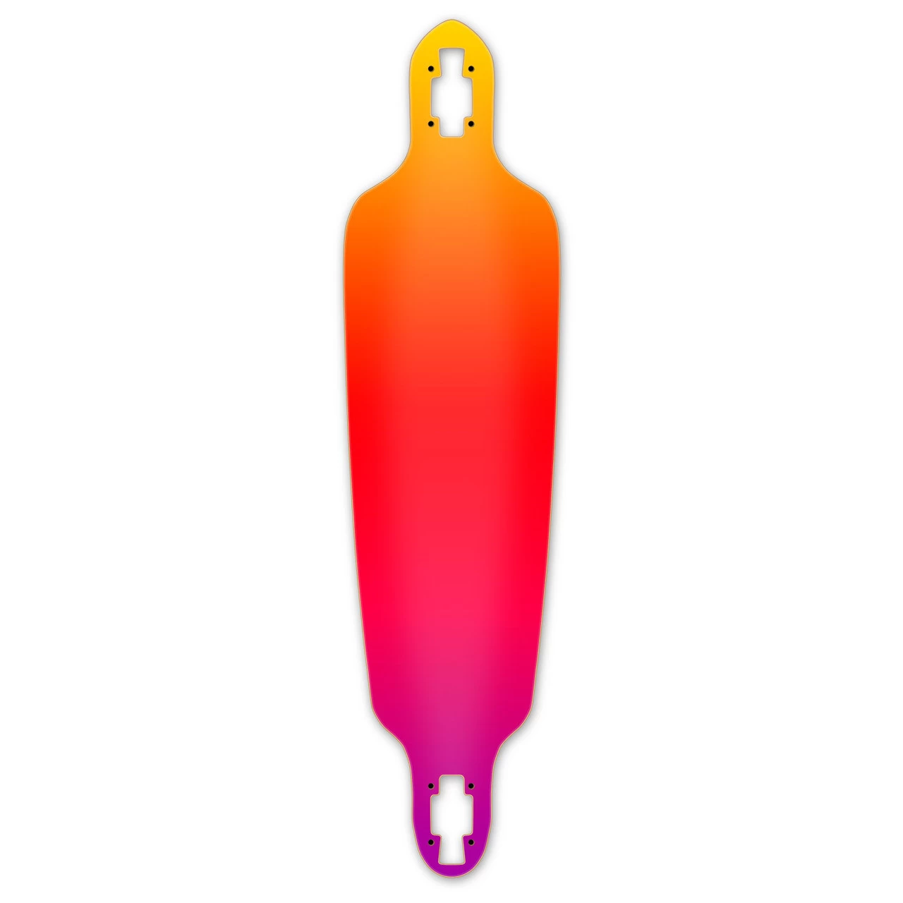 Gradient Pink Drop Through Longboard The cutouts on the nose and tail allow the trucks to be top-mounted. Top-mounted trucks allow this shape deck to have more stability when riding at speeds that may not be suitable for beginners. The medium concave and low flex allows the rider to maintain control when carving or sliding at higher speeds. Pink This pink color scheme displays hues of red, pink, purple, and orange similar to the colors of the sky during summer sunsets.
