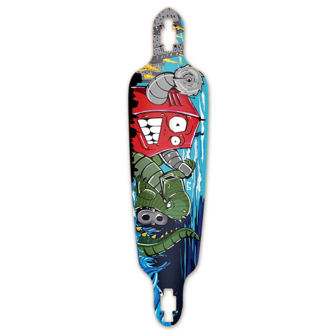 Robot Drop Through Longboard The cutouts on the nose and tail allow the trucks to be top-mounted. Top-mounted trucks allow this shape deck to have more stability when riding at speeds that may not be suitable for beginners. The medium concave and low flex allows the rider to maintain control when carving or sliding at higher speeds. Robot This graphic depicts our giant Yocaher robot accidentally destroying a city while fighting a giant wind-up godzilla.