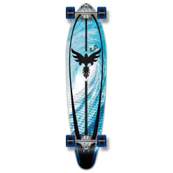 Complete “Tsunami” Kicktail Longboard The Kicktail is similar to the pintail shape, but the kicktail shape has a few different features that allows the deck to give the rider more utility. It features a low grade of concave and a kicktail to give riders a more control when riding. Tsunami This graphic depicts the shadow of an eagle soaring through the heart of a tsunami.