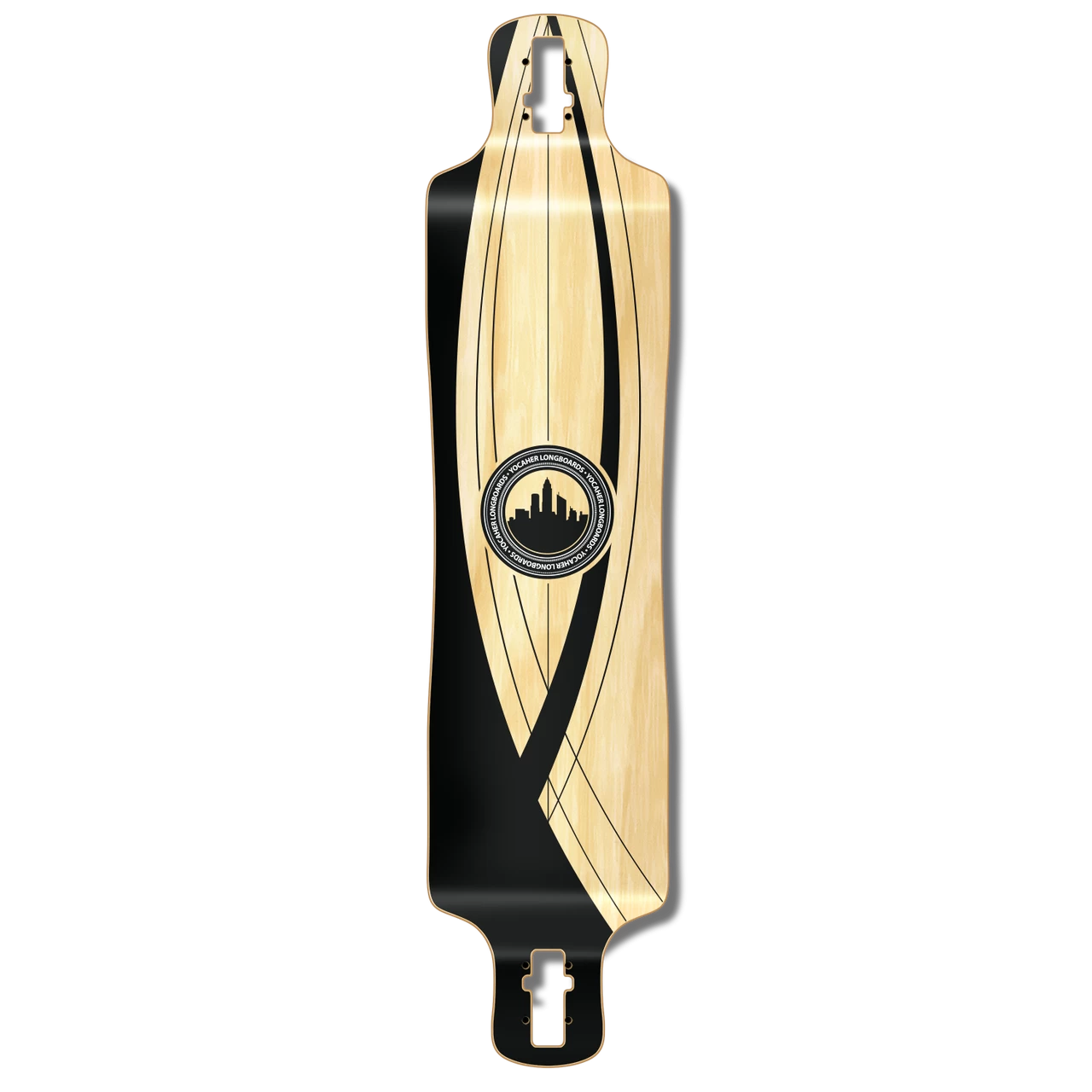 Crest Onyx Lowrider Longboard Deck – The lowrider provides the notable features from the Drop Through and Drop Down deck styles. The trucks are top mounted and the foot platform sits lower than the trucks. This shape deck allows for gnarly shredding and free-ride capabilities. This deck shape is designed for experienced riders. Crest This design is the unique Yocaher crest with either a black or burgandy background.