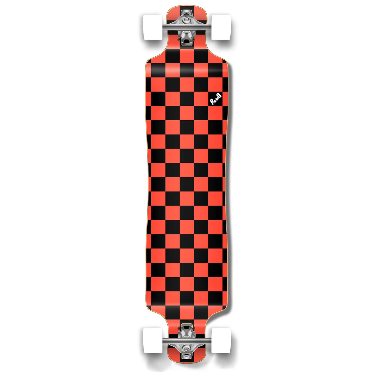 Complete Checker Lowrider Longboard The lowrider provides the notable features from the Drop Through and Drop Down deck styles. The trucks are top mounted and the foot platform sits lower than the trucks. This shape deck allows for gnarly shredding and free-ride capabilities. This deck shape is designed for experienced riders. Checker This great checker pattern can be found in multiple color variations including blue, red, green, purple, white, pink, yellow, orange, and silver checkers