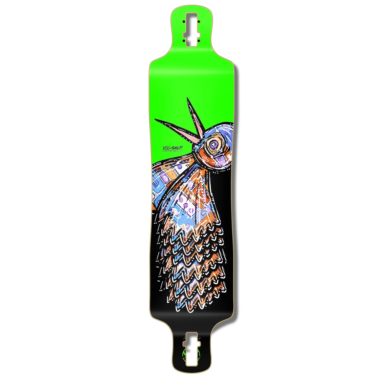 The Bird Series Lowrider Longboard The lowrider provides the notable features from the Drop Through and Drop Down deck styles. The trucks are top mounted and the foot platform sits lower than the trucks. This shape deck allows for gnarly shredding and free-ride capabilities. This deck shape is designed for experienced riders. The Bird Series The bird series depicts our unique Yocaher bird. The graphic can be found with either a reg, green, or woodgrain colored background.