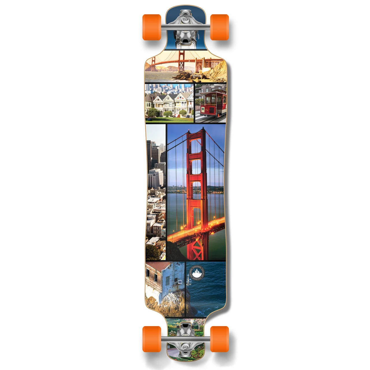 Complete San Francisco Lowrider Longboard The lowrider provides the notable features from the Drop Through and Drop Down deck styles. The trucks are top mounted and the foot platform sits lower than the trucks. This shape deck allows for gnarly shredding and free-ride capabilities. This deck shape is designed for experienced riders. San Francisco As part of our CitySkape collection this graphic depicts some of the most major attractions of San Francisco