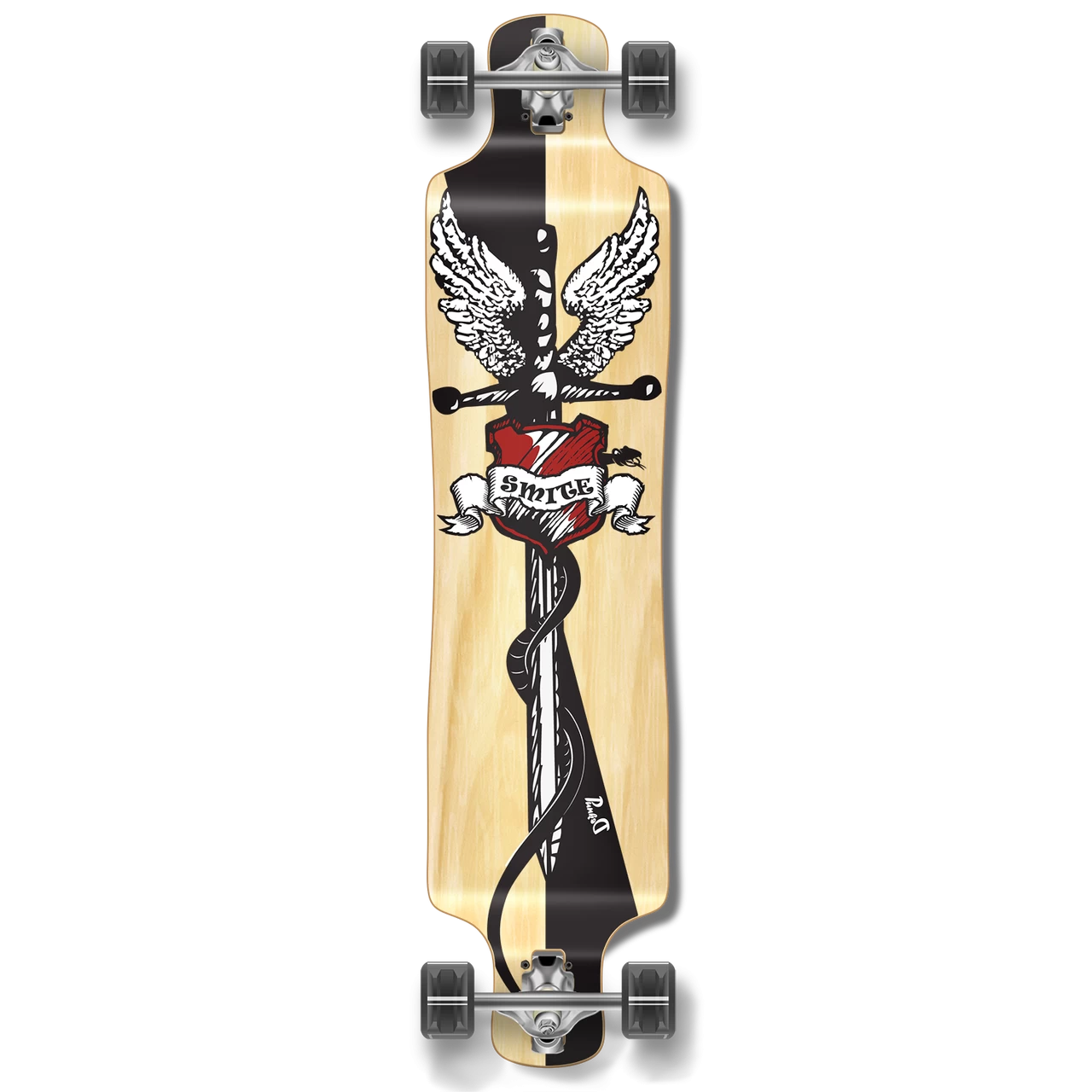 Complete Smite Lowrider Longboard The lowrider provides the notable features from the Drop Through and Drop Down deck styles. The trucks are top mounted and the foot platform sits lower than the trucks. This shape deck allows for gnarly shredding and free-ride capabilities. This deck shape is designed for experienced riders. This graphic depicts an angelic sword and shield used to smite the evil skateboarding foes.