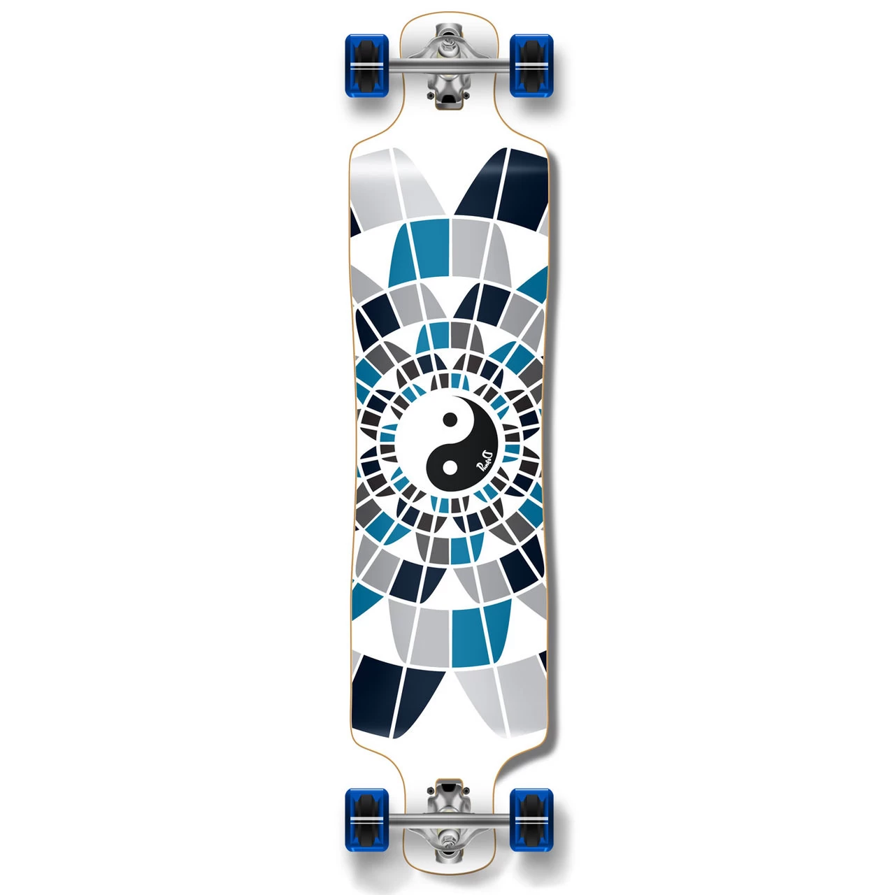 Complete YingYang Lowrider Longboard The lowrider provides the notable features from the Drop Through and Drop Down deck styles. The trucks are top mounted and the foot platform sits lower than the trucks. This shape deck allows for gnarly shredding and free-ride capabilities. This deck shape is designed for experienced riders. Yin-Yang This giant yin-yang design is reminiscent of a yin-yangesque flower, blossoming from the center outwards.