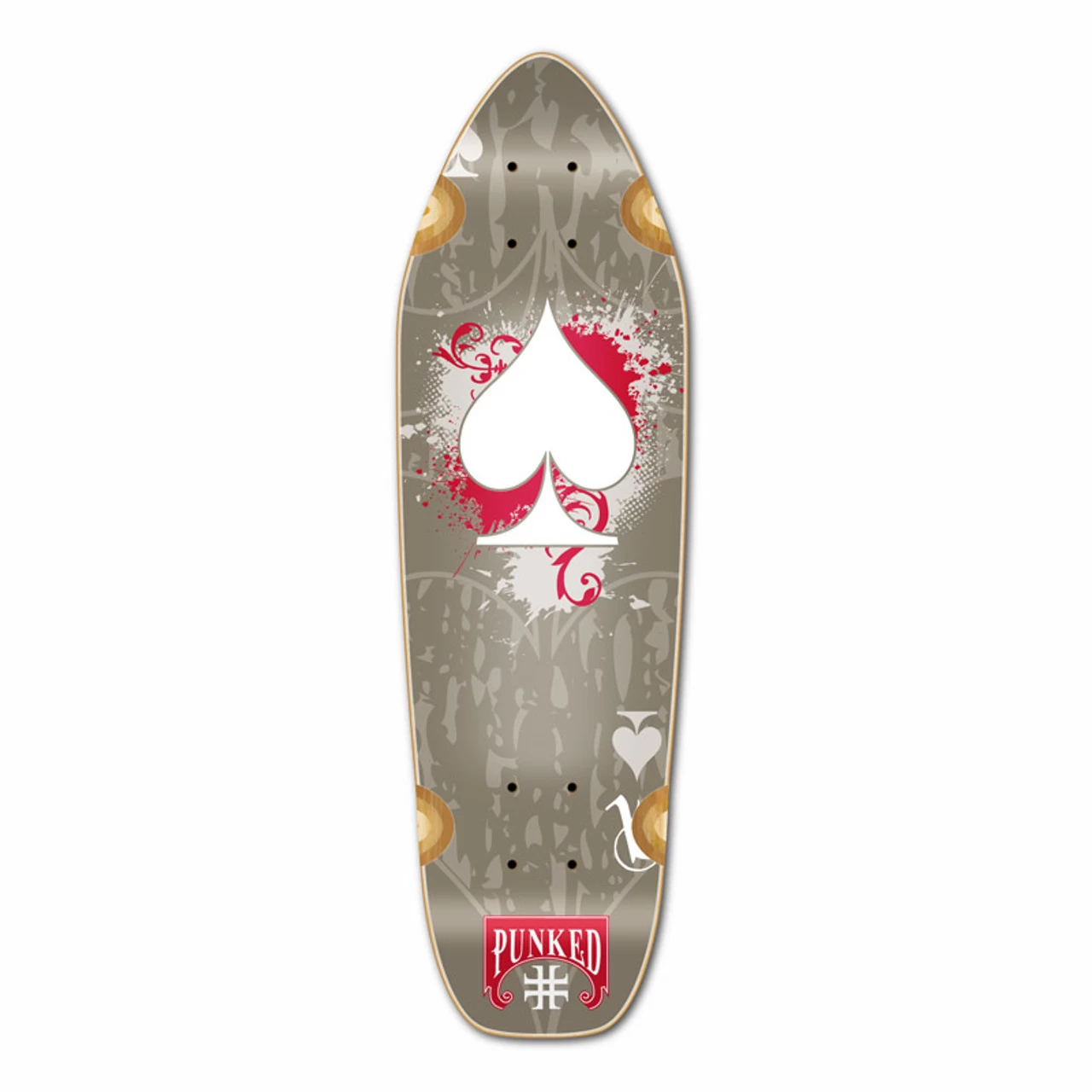 Ace of Spades – Grey Mini Cruiser This small deck shape is most popularly known as a campus cruiser. Its small size allows intense carving and total control when utilizing the kicktail for sharp turns. Ace of Spades This graphic depicts the ace of spades. It comes in three color combinations including a black ace over a white background, or a white ace over either a black or grey background.
