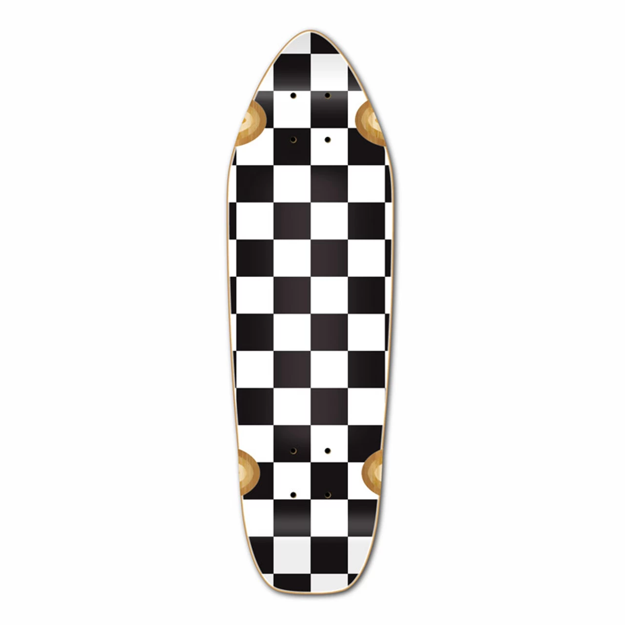 Checker Mini Cruiser This small deck shape is most popularly known as a campus cruiser. Its small size allows intense carving and total control when utilizing the kicktail for sharp turns. Checker This great checker pattern can be found in multiple color variations including blue, red, green, purple, white, pink, yellow, orange, and silver checkers.