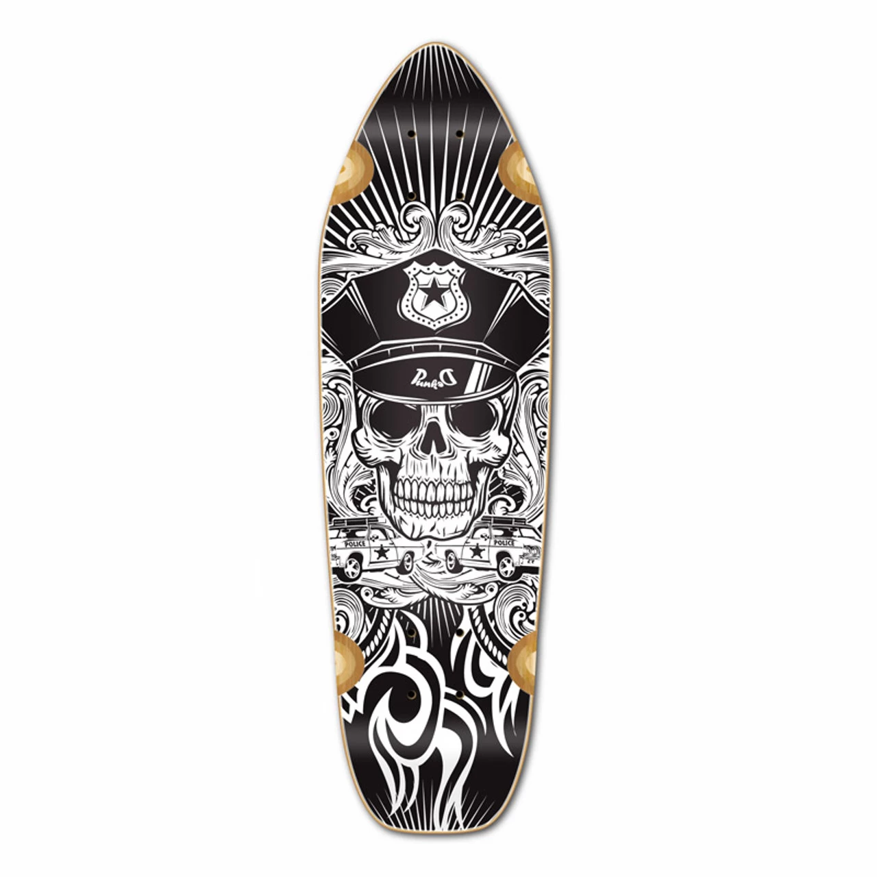 Skull Cop Mini Cruiser This small deck shape is most popularly known as a campus cruiser. Its small size allows intense carving and total control when utilizing the kicktail for sharp turns. Skull Cop A gnarly skull wearing an oldschool police hat being surrounded by oldschool police cruisers.