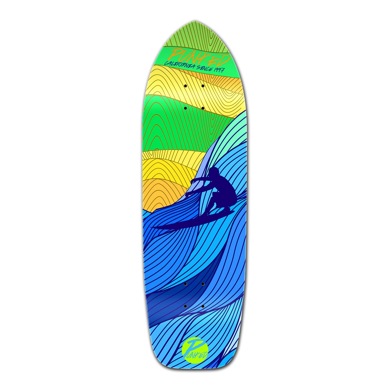 Blue Surf’s Up Old School Complete The old school board is a classic. The retro style deck features a 16′ wheelbase, which is the industry standard for a pool thrasher. With a nose slightly longer than other boards with the same wheelbase, the Old School Cruiser will allow the rider to perform more tricks and the option for different styles of pool shredding. It has old school flavor, with a modern twist. Surf’s Up This graphic is a stylized version of an iconic California scene; enjoying a day at the beach and surfing big waves. Being available on most longboard styles, this design will have you feeling good about carving the street just like you would carve the waves.