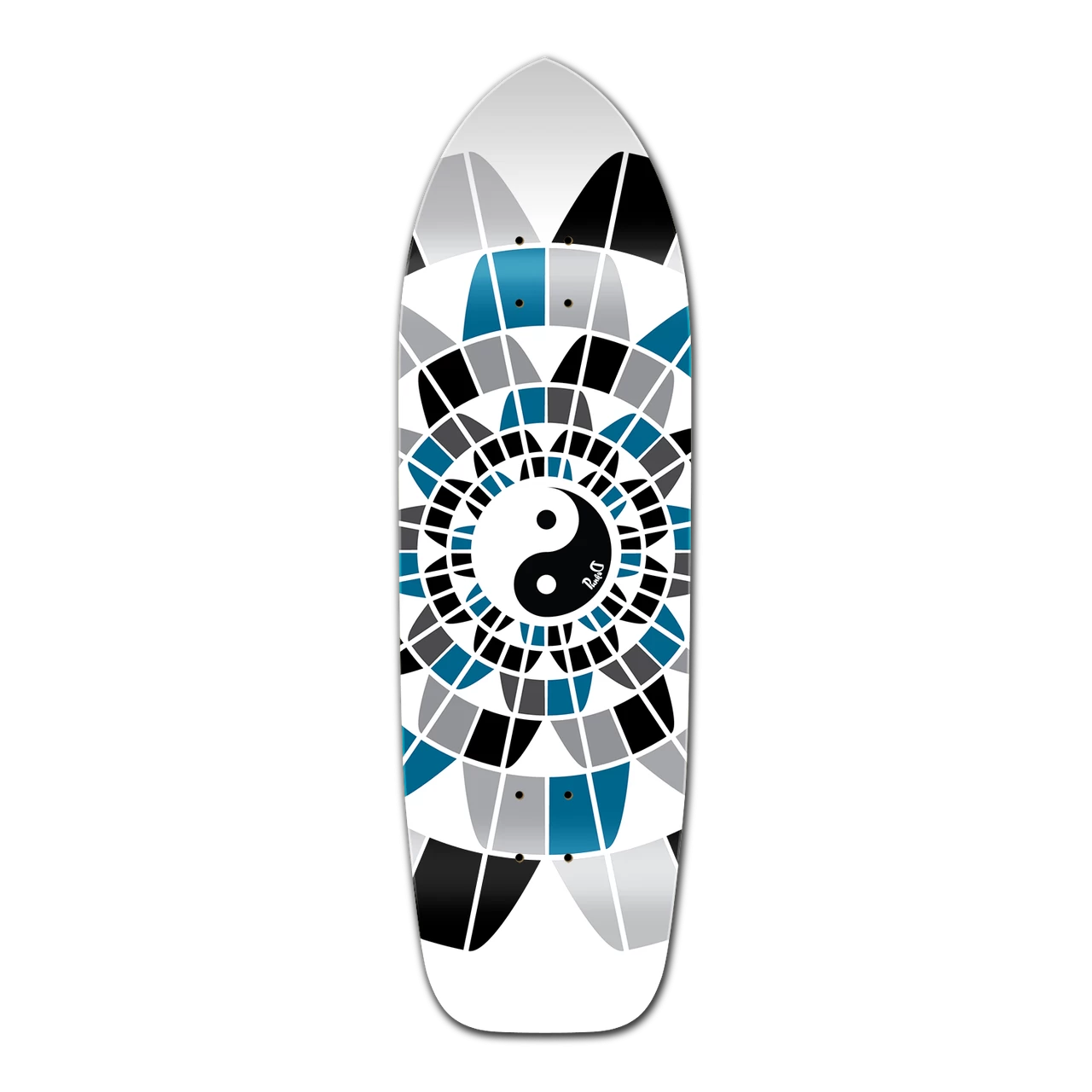 YingYang Old School Complete The old school board is a classic. The retro style deck features a 16′ wheelbase, which is the industry standard for a pool thrasher. With a nose slightly longer than other boards with the same wheelbase, the Old School Cruiser will allow the rider to perform more tricks and the option for different styles of pool shredding. It has old school flavor, with a modern twist. Ying-Yang This giant yin-yang design is reminiscent of a yin-yangesque flower, blossoming from the center outwards.