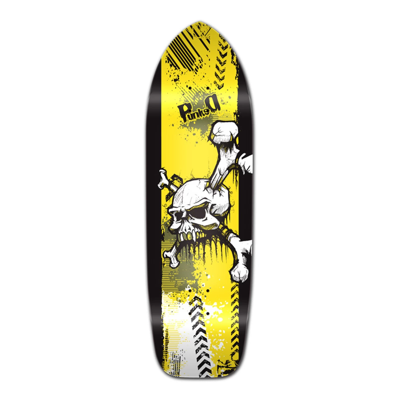Y-Skull Old School Skateboard The old school board is a classic. The retro style deck features a 16′ wheelbase, which is the industry standard for a pool thrasher. With a nose slightly longer than other boards with the same wheelbase, the Old School Cruiser will allow the rider to perform more tricks and the option for different styles of pool shredding. It has old school flavor, with a modern twist. Y-Skull Our version of a skull and crossbones over a yellow graphic background