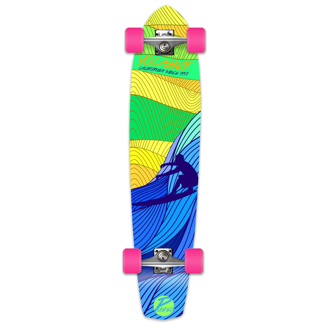 Complete Surf’s Up Slimkick Longboard The Slimkick brings back a vintage classic. The deck is flat and has a kicktail with no flex. This board is perfect for cruising around. Surf’s Up This graphic is a stylized version of an iconic California scene; enjoying a day at the beach and surfing big waves. Being available on most longboard styles, this design will have you feeling good about carving the street just like you would carve the waves.