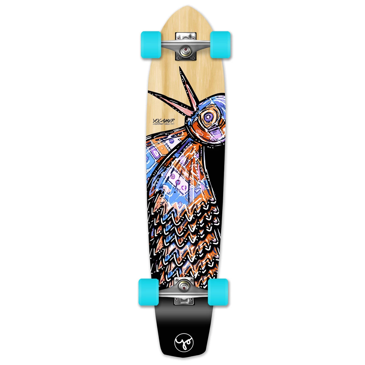 Complete The Bird Series Slimkick Longboard The Slimkick brings back a vintage classic. The deck is flat and has a kicktail with no flex. This board is perfect for cruising around. The Bird Series The bird series depicts our unique Yocaher bird. The graphic can be found with either a reg, green, or woodgrain colored background.