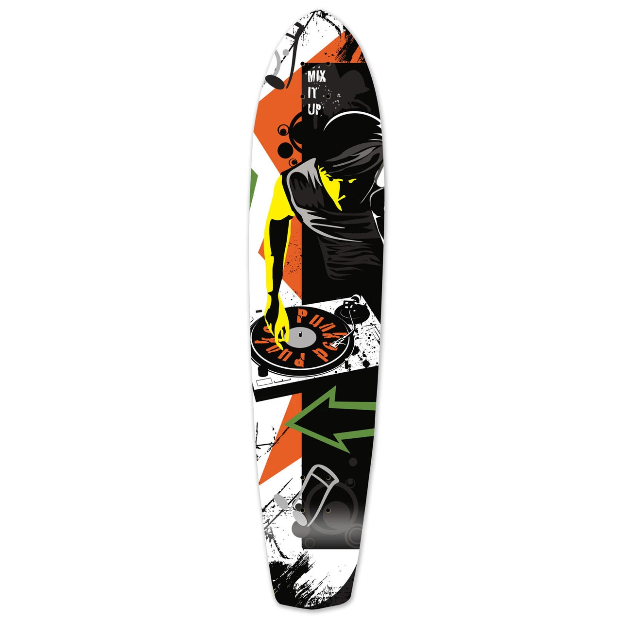 Mix-It-Up DJ Slimkick Longboard The Slimkick brings back a vintage classic. The deck is flat and has a kicktail with no flex. This board is perfect for cruising around. MIX-IT-UP DJ This fun graphic depicts our visualization of music, and how it takes you to that special place when you are skating.
