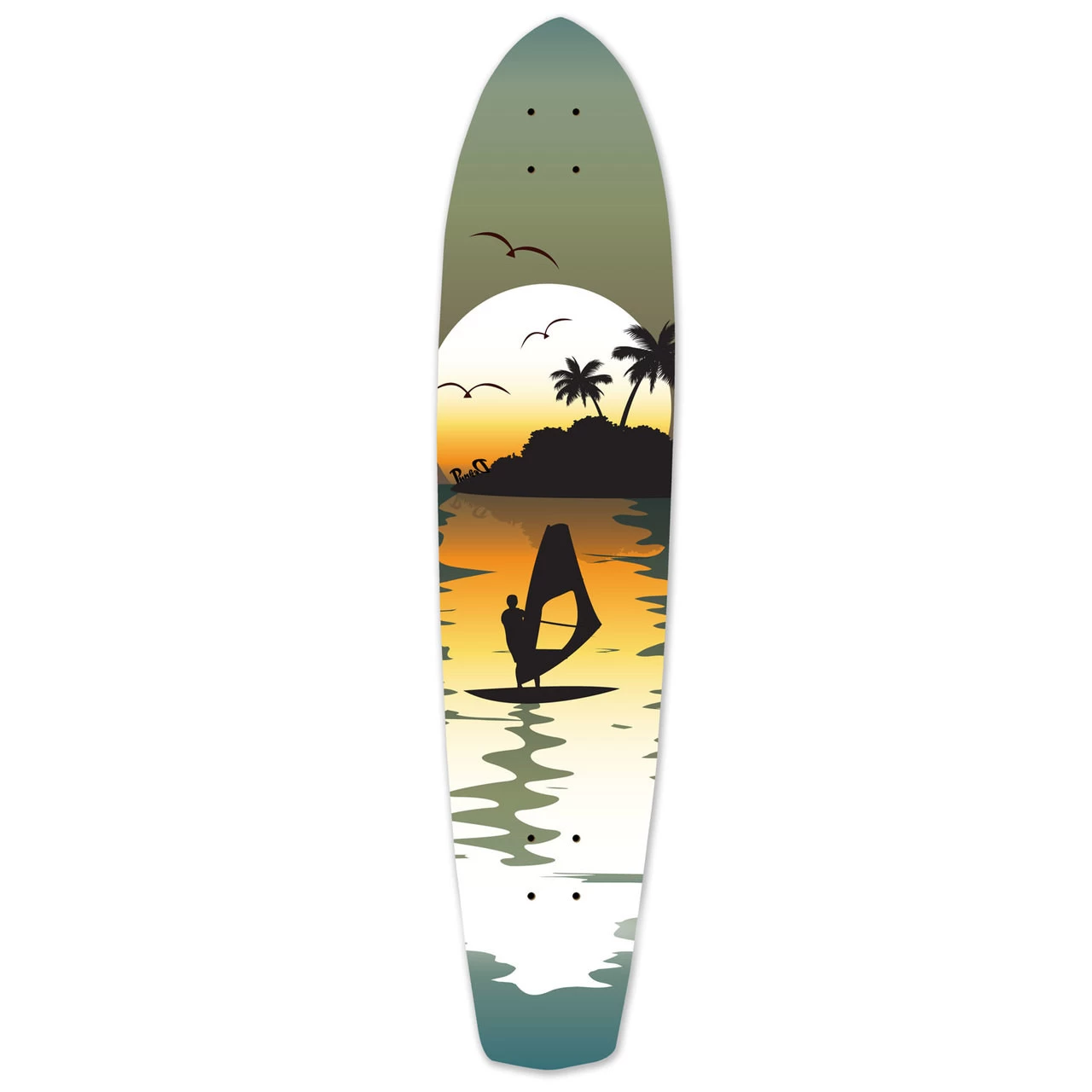 Surfer Slimkick Longboard The Slimkick brings back a vintage classic. The deck is flat and has a kicktail with no flex. This board is perfect for cruising around. Surfer This tranquil scene depicts a wind-surfer going all day into the sunset. This design can be found with a painted packground or a woodgrain background.