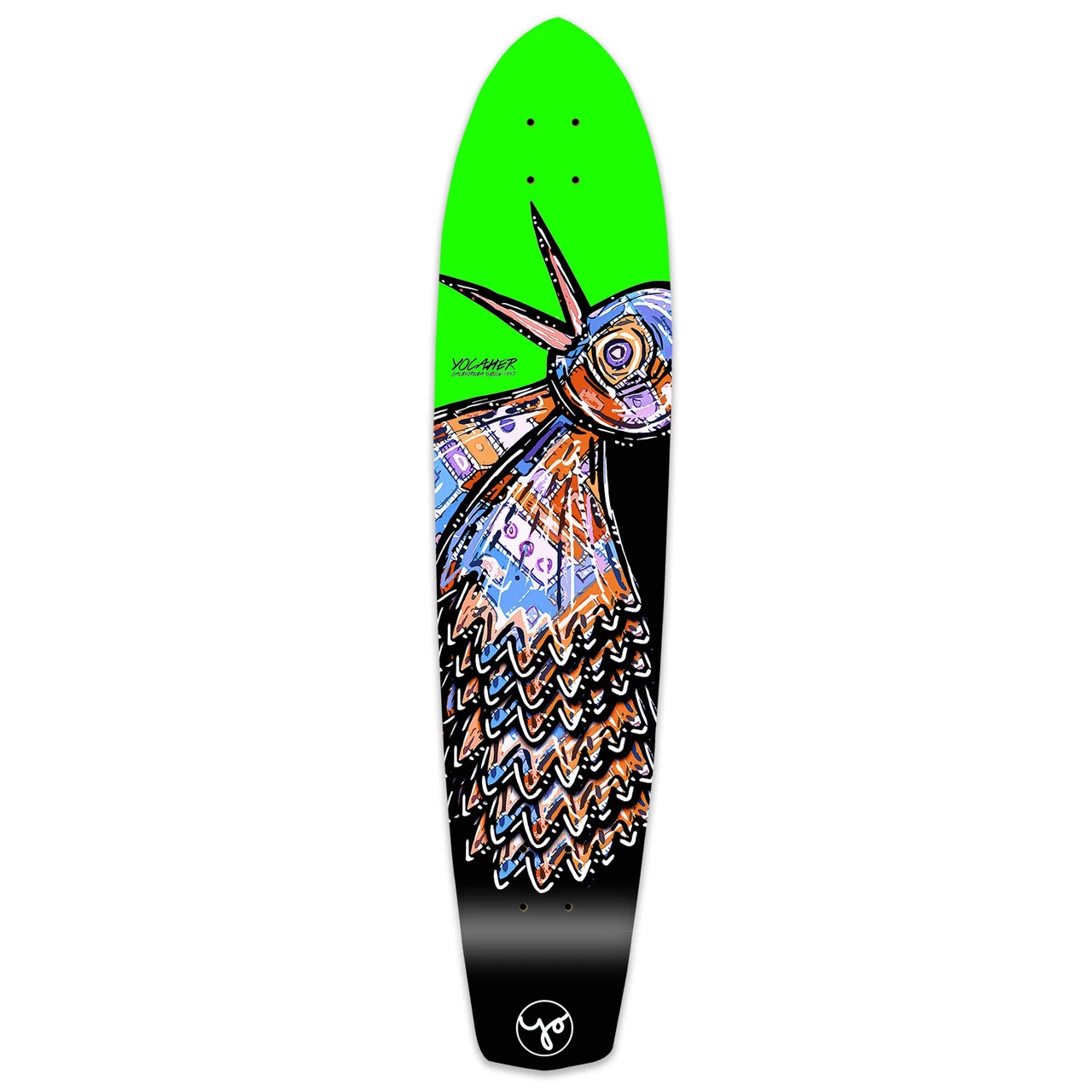 The Bird Series Slimkick Longboard The Slimkick brings back a vintage classic. The deck is flat and has a kicktail with no flex. This board is perfect for cruising around. The Bird Series The bird series depicts our unique Yocaher bird. The graphic can be found with either a reg, green, or woodgrain colored background.