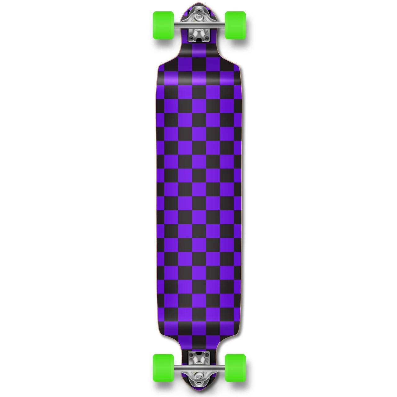Complete Checker Drop Down Longboard The Drop Down deck is designed to provide with the rider with a lower center of gravity since the foot platform sits lower than the trucks. With no flex, the Drop Down is capable of achieving high speed and is perfect for Downhill riding Checker This great checker pattern can be found in multiple color variations including blue, red, green, purple, white, pink, yellow, orange, and silver checkers