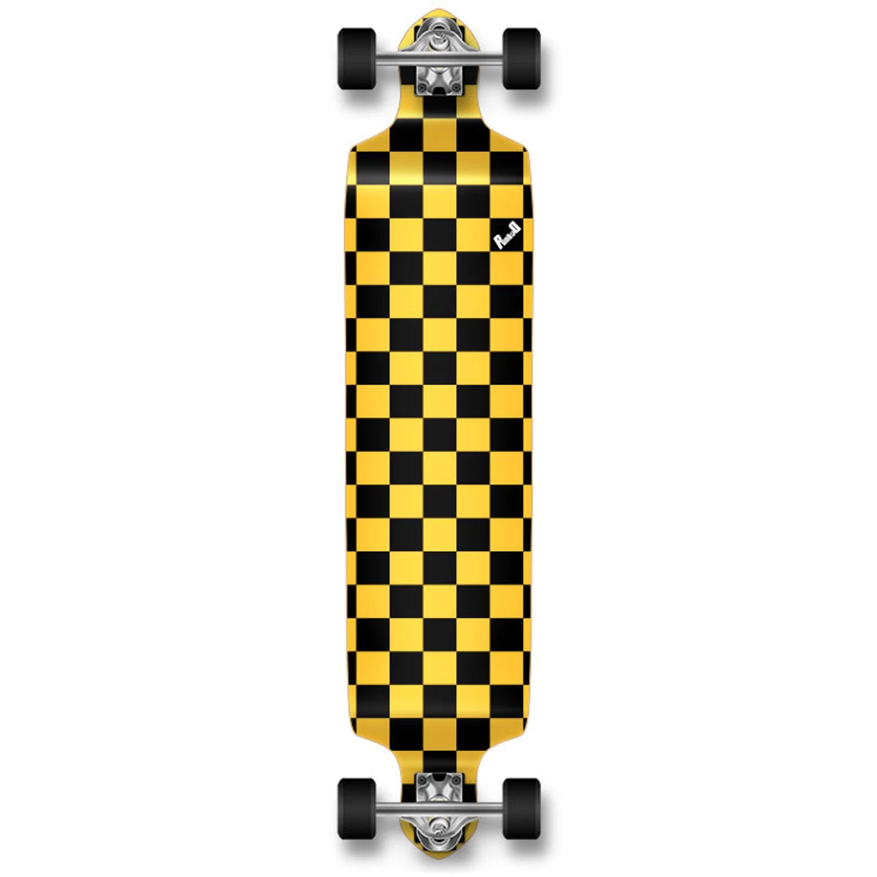 Complete Checker Drop Down Longboard The Drop Down deck is designed to provide with the rider with a lower center of gravity since the foot platform sits lower than the trucks. With no flex, the Drop Down is capable of achieving high speed and is perfect for Downhill riding Checker This great checker pattern can be found in multiple color variations including blue, red, green, purple, white, pink, yellow, orange, and silver checkers