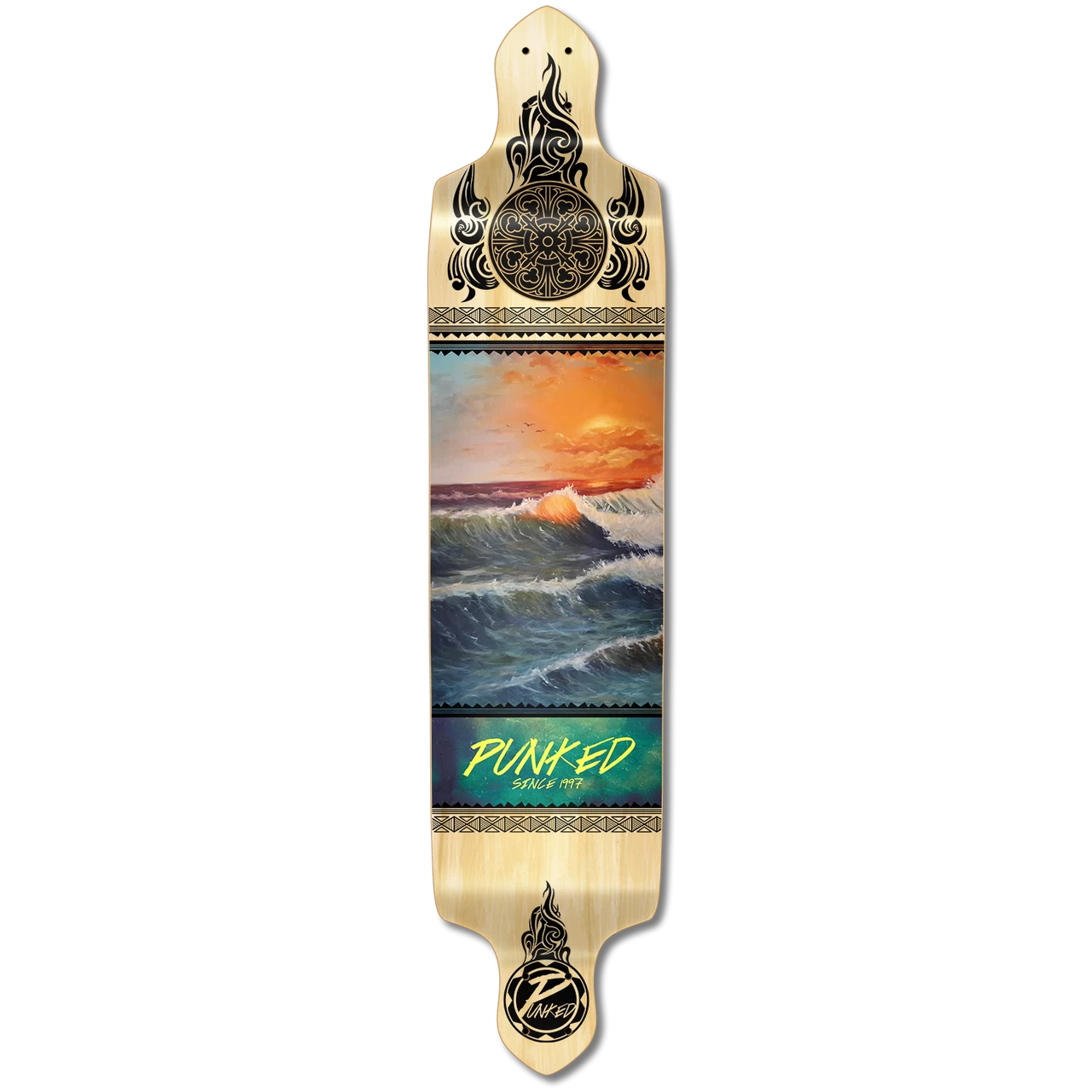 Wave Scene Drop Down Longboard The Drop Down deck is designed to provide with the rider with a lower center of gravity since the foot platform sits lower than the trucks. With no flex, the Drop Down is capable of achieving high speed and is perfect for Downhill riding Wave Scene This beautiful graphic depicts the end of an amazing and tranquil day. The sun is finally setting over the never ending waves of the Pacific Ocean, right off the California coast.