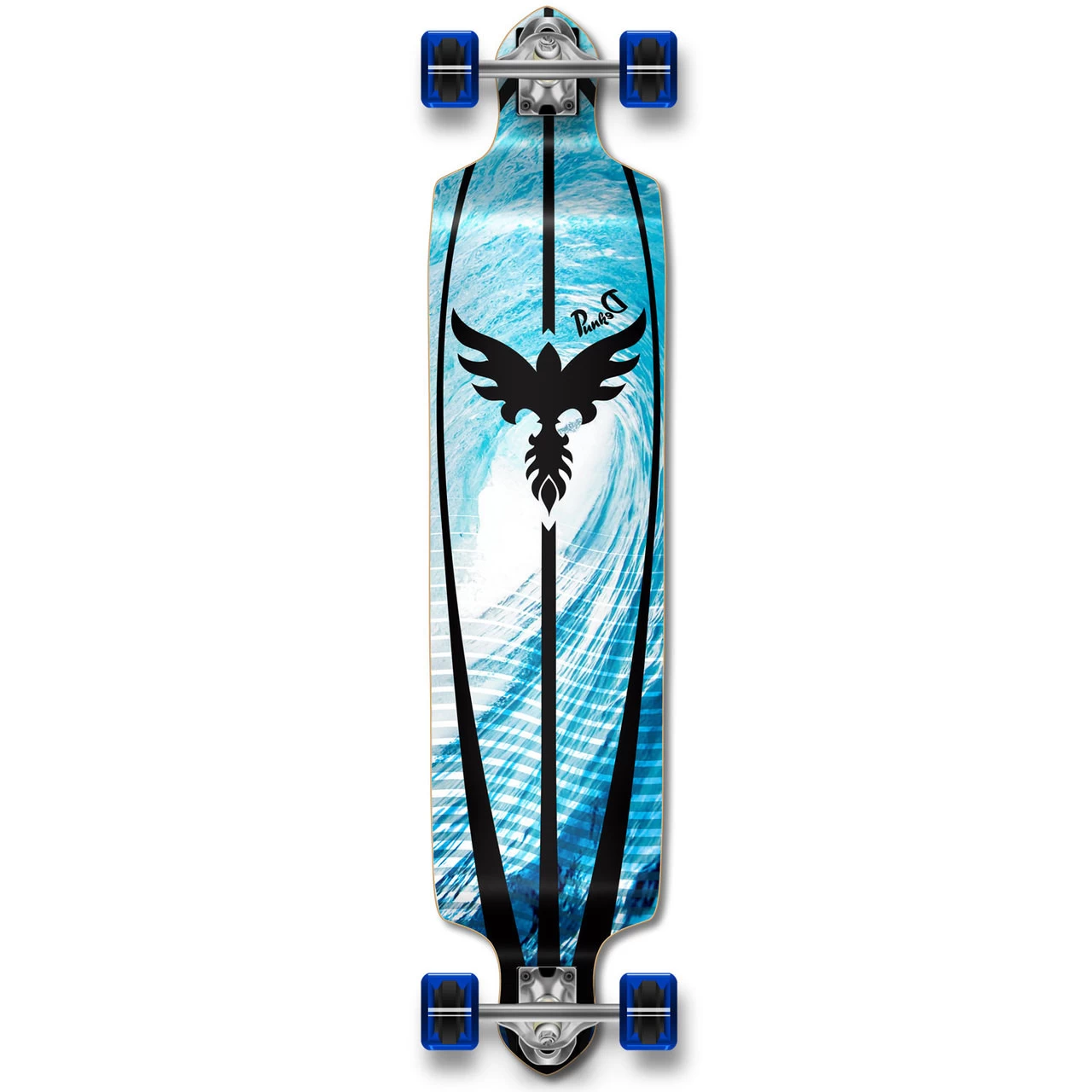 Complete Tsunami Drop Down Longboard The Drop Down deck is designed to provide with the rider with a lower center of gravity since the foot platform sits lower than the trucks. With no flex, the Drop Down is capable of achieving high speed and is perfect for Downhill riding Digital Wave This board is a new age digital rendition of waves running parallel to each other across the sides of the board. Tsunami This graphic depicts the shadow of an eagle soaring through the heart of a tsunami.