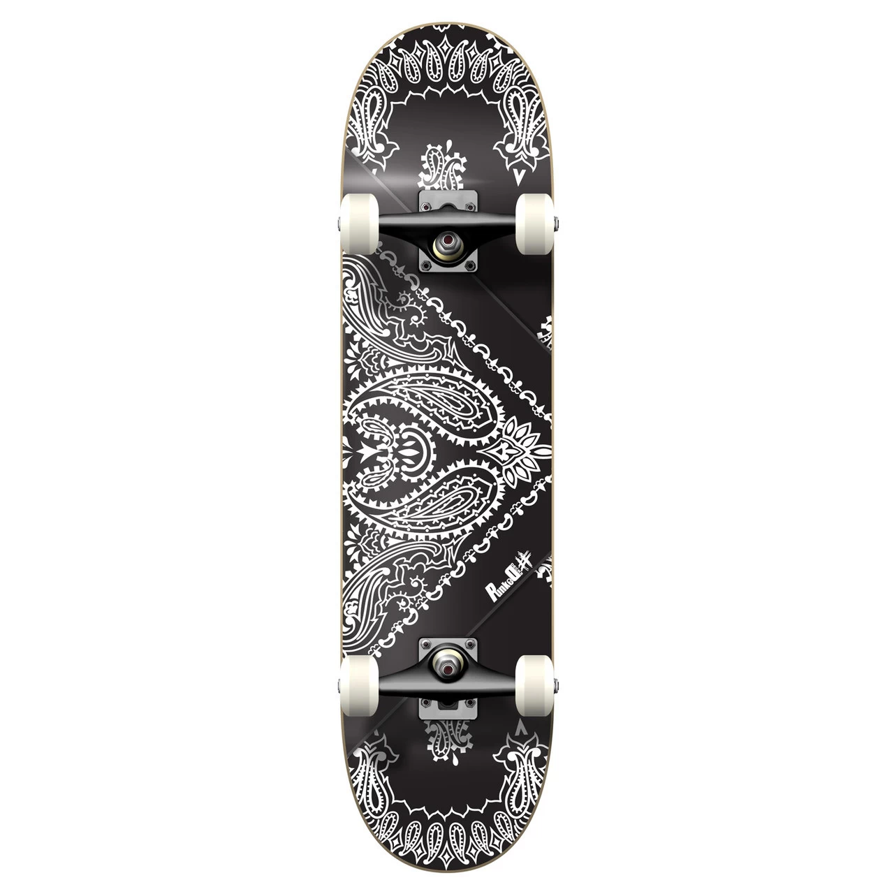 Complete Bandana The classic bandana design which is available im multiple colors, including: black, white, red, blue and baby blue. This new school skateboard comes with a mellow concave allowing for a more flat-footed skating style. The edges of the board are not so bowled compared to medium and steep concaves.