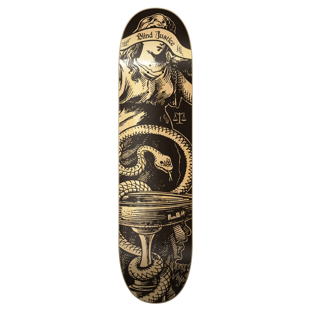 Natural Blind Justice Skateboard This new school skateboard comes with a mellow concave allowing for a more flat-footed skating style. The edges of the board are not so bowled compared to medium and steep concaves. Blind Justice This is a righteous graphic featuring the Lady of justice, Venemous snake, and a chalice. This graphic can be found in either black and white, or black and woodgrain.