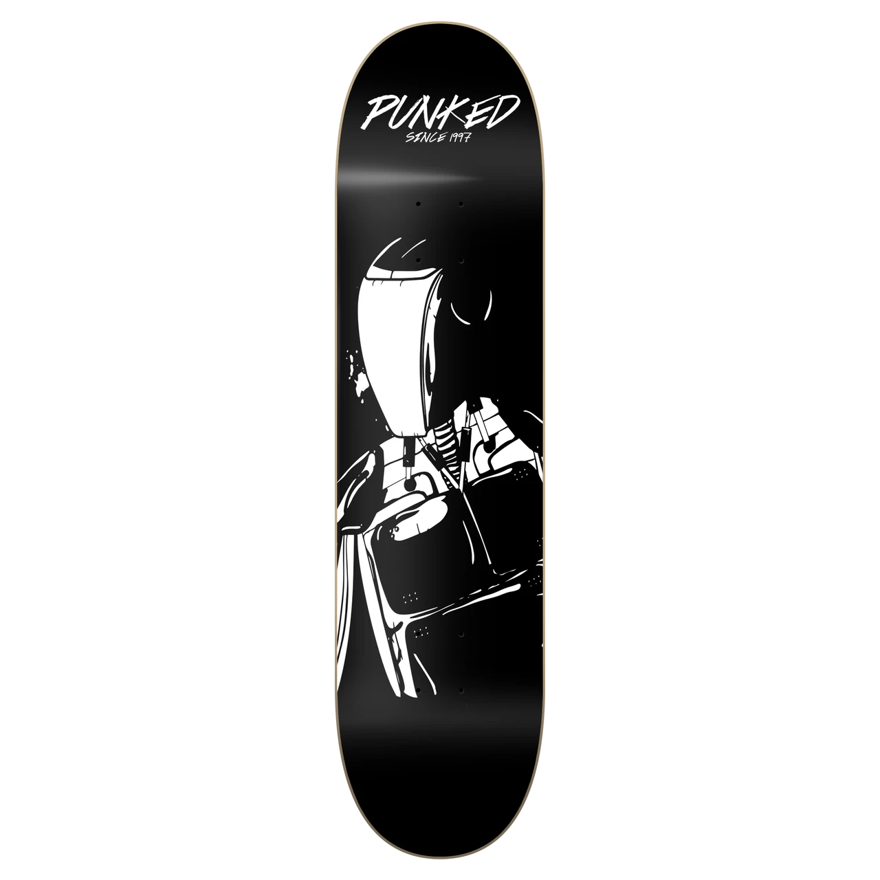 Robo -Robot Punked Skateboard Deck. This new school skateboard comes with a mellow concave allowing for a more flat-footed skating style. The edges of the board are not so bowled compared to medium and steep concaves. Robo Designed perfectly for those who are mechanically precise when it comes to skating. Skating clean lines, performing flawless tricks, and having spotless landings is what this graphic is all about.