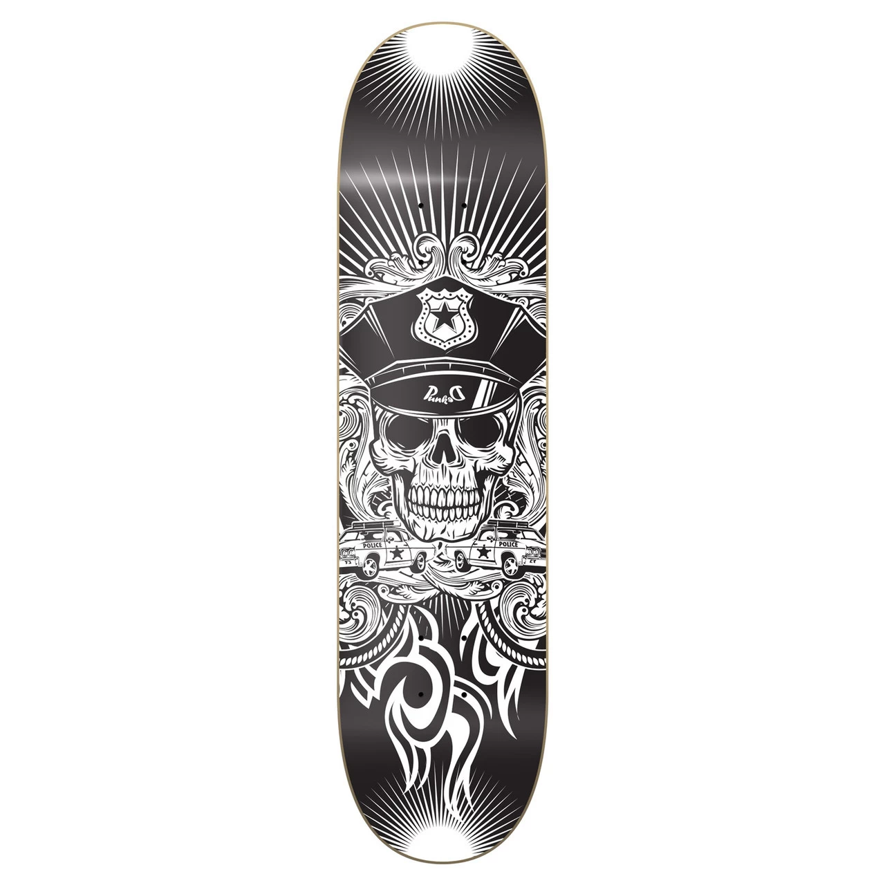 Skull Cop Skateboard This new school skateboard comes with a mellow concave allowing for a more flat-footed skating style. The edges of the board are not so bowled compared to medium and steep concaves. Skull Cop A gnarly skull wearing an oldschool police hat being surrounded by oldschool police cruisers.