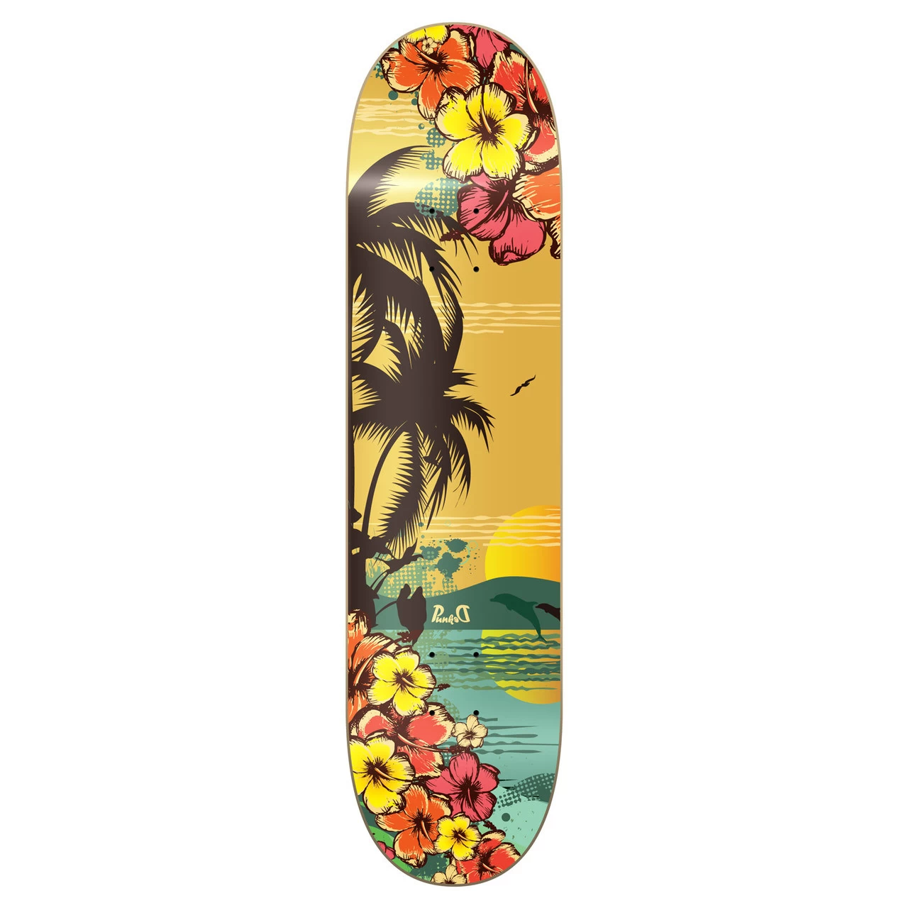 Tropical Day Skateboard This new school skateboard comes with a mellow concave allowing for a more flat-footed skating style. The edges of the board are not so bowled compared to medium and steep concaves. Tropical Day A wonderful tranquil tropical scene that can be found in either warm daytime, or cool nighttime colors.