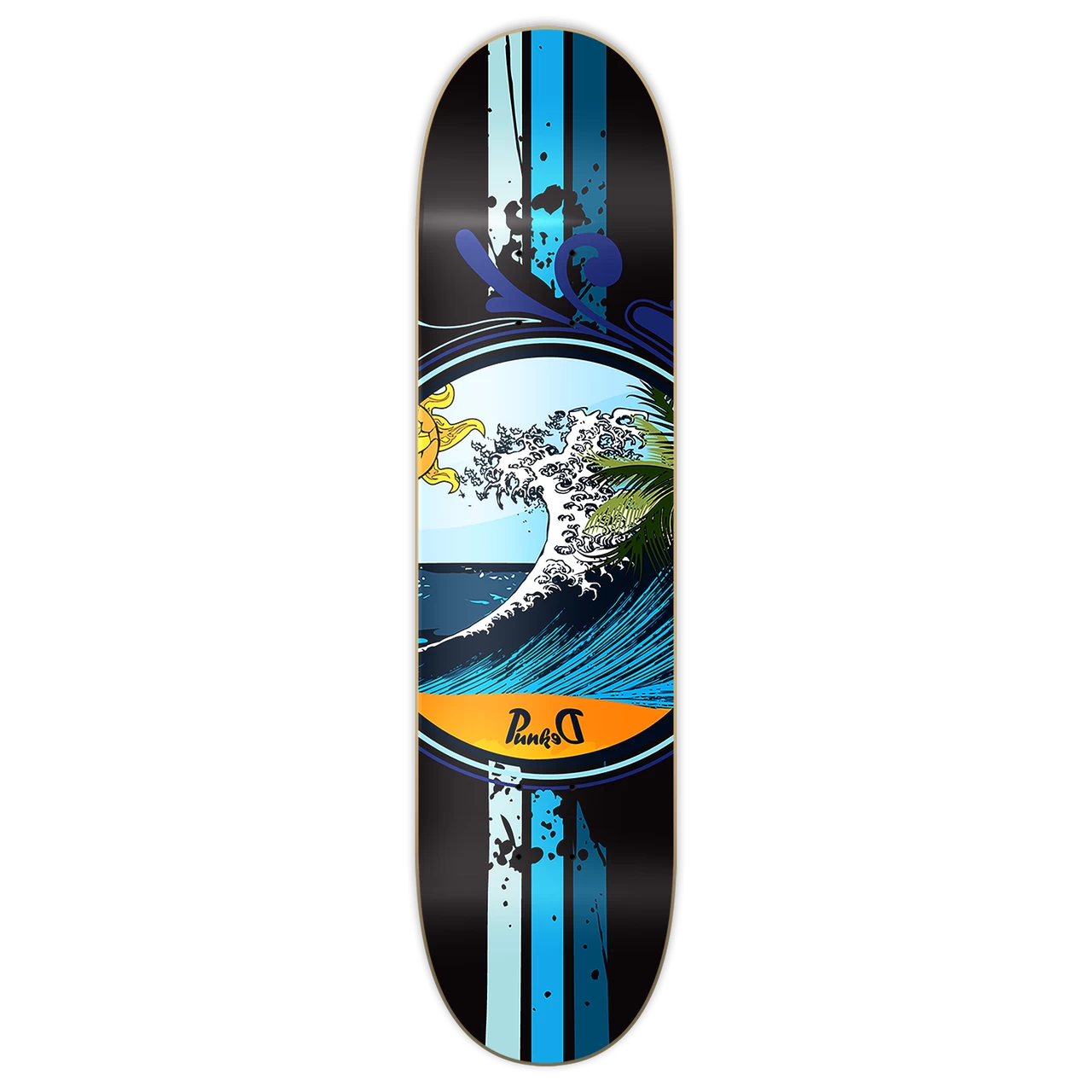 Complete Wave Skateboard This new school skateboard comes with a mellow concave allowing for a more flat-footed skating style. The edges of the board are not so bowled compared to medium and steep concaves. Wave This graphic depicts a giant wave at the point where it begins to curl, with the sun looming in the background. In combination, the two images make for one awesome graphic.