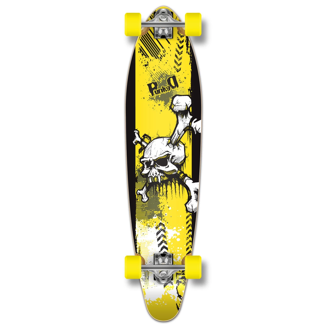 Complete Y-Skull Kicktail Longboard The Kicktail is similar to the pintail shape, but the kicktail shape has a few different features that allows the deck to give the rider more utility. It features a low grade of concave and a kicktail to give riders a more control when riding. Y-Skull Our version of a skull and crossbones over a yellow graphic background